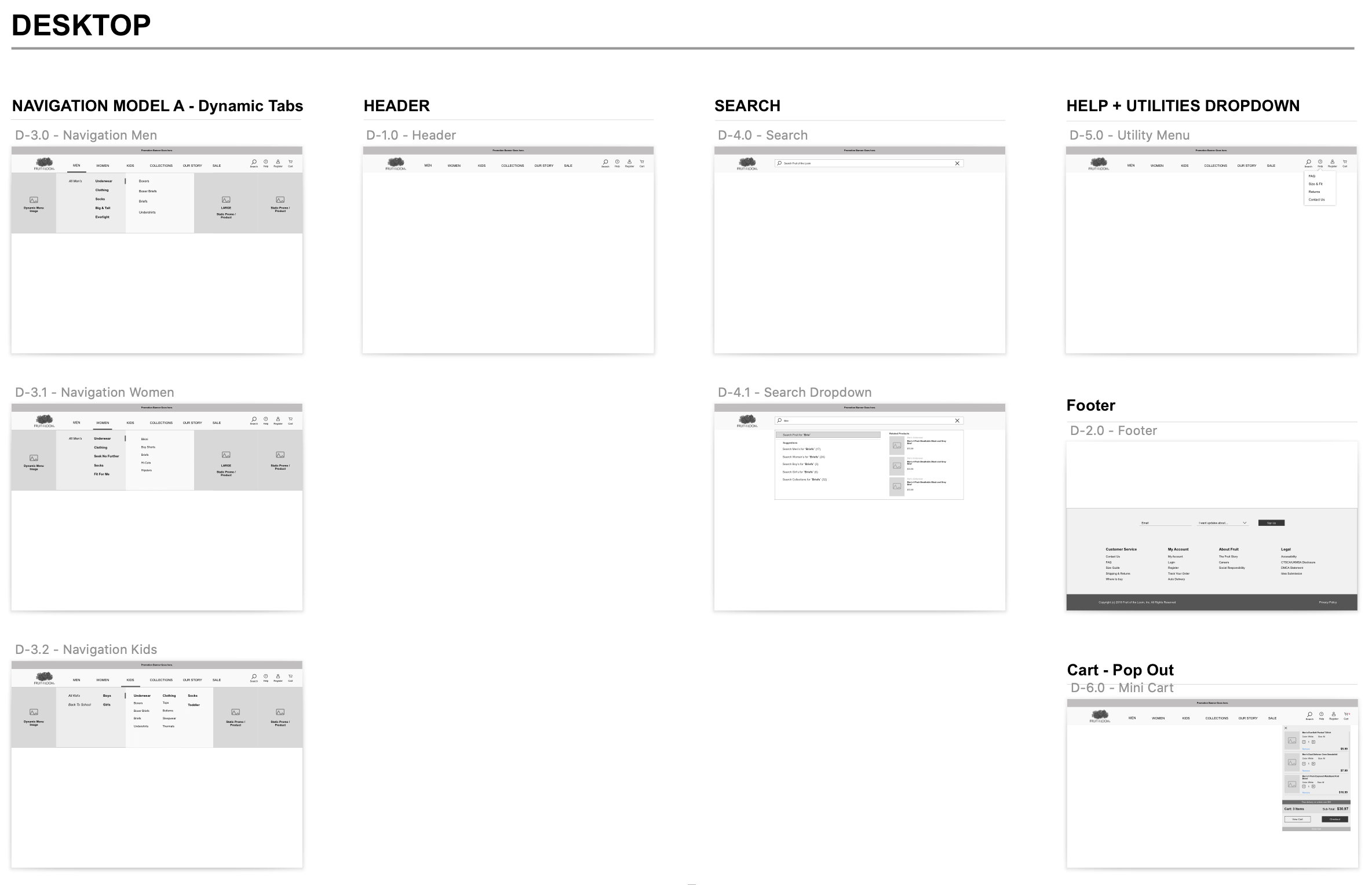 In sprint 1, I wireframed out the navigation dropdown menus and global elements such as header, footer and search.