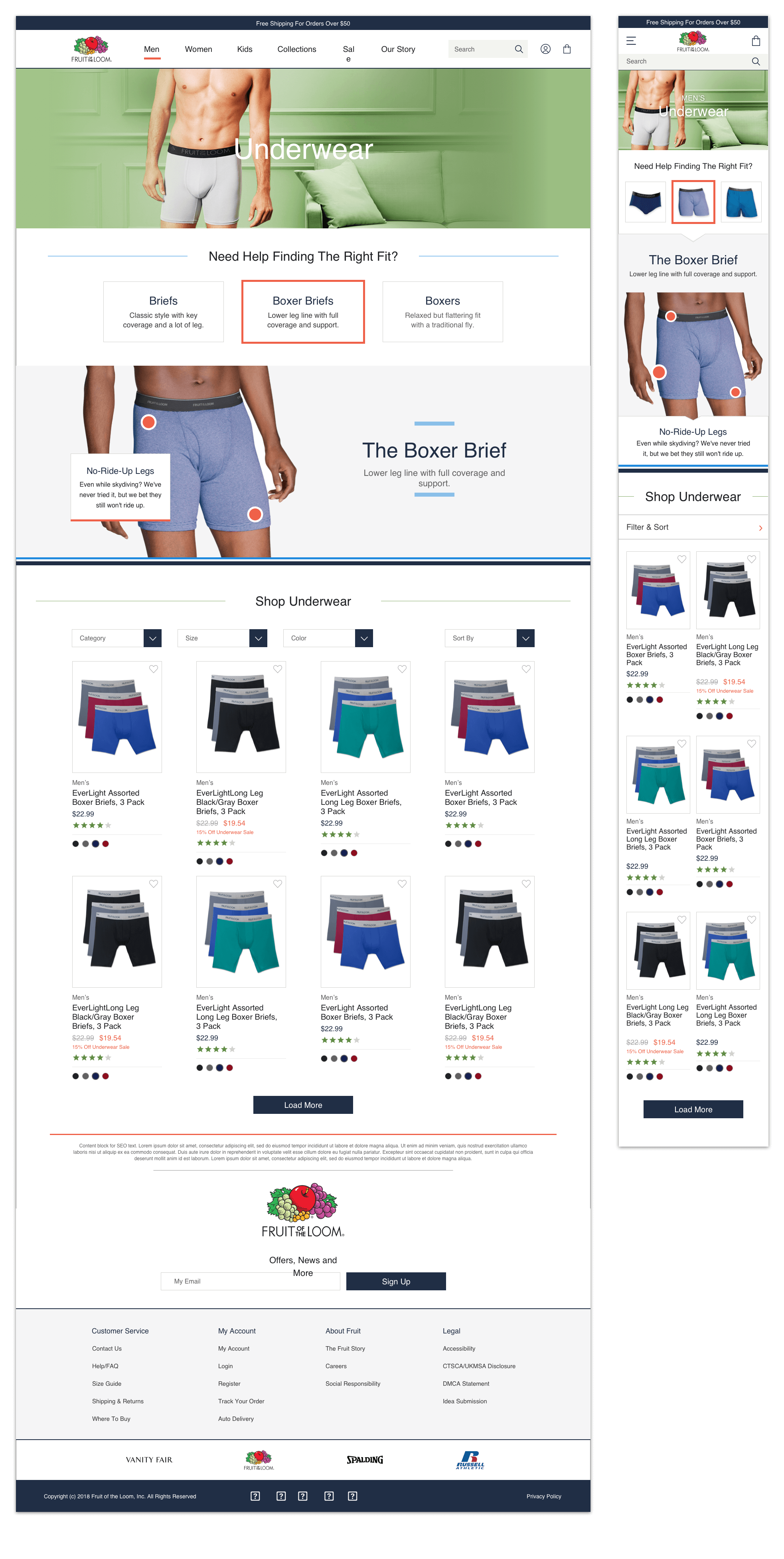 In 2018 I worked as part of a team to fully redesign the Fruit of the Loom eCommerce site. Our challenge was too modernize the site and create a fresh new digital shopping experience that would connect with younger customers and provide a platform for Fruit of the Loom to further grow their brand in the future.