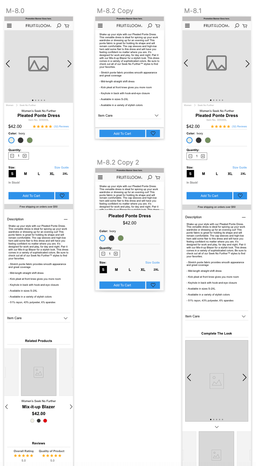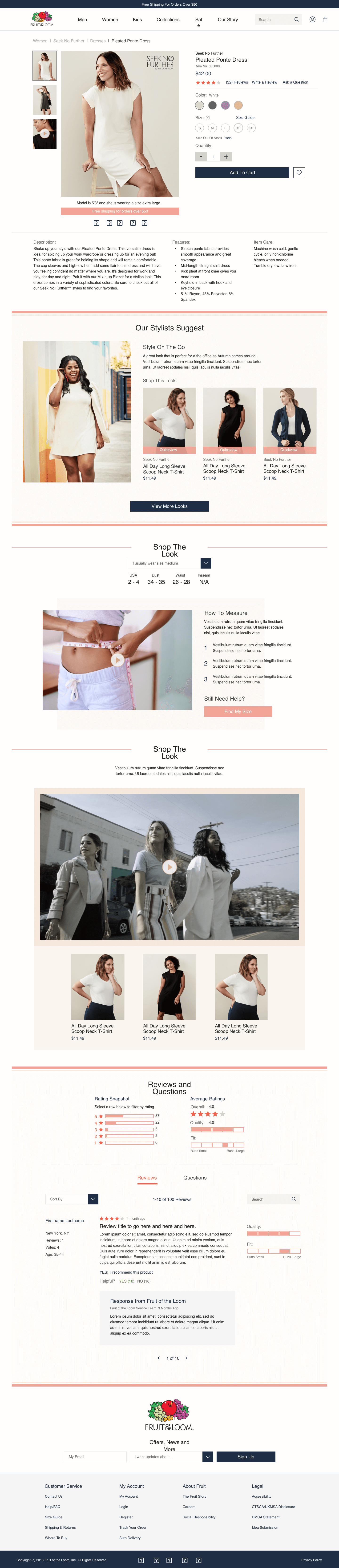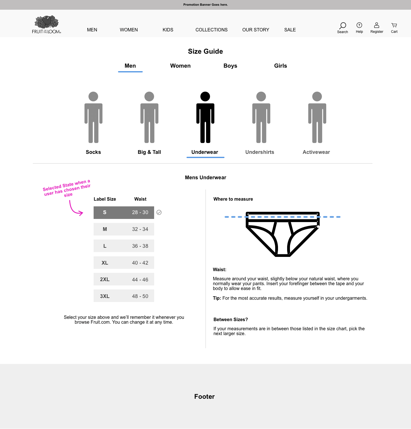 For sprint 4, I focused on the homepage and a comprehensive size guide module. Since Fruit’s main product was comfy underwear we knew we needed to create a strong sizing guide that would provide customers with more knowledge and more confidence when deciding to purchase a pair online. We researched best in class sizing guides and worked with Fruit experts to make a dynamic, easy to use and clear to understand guide for finding the perfect fit.