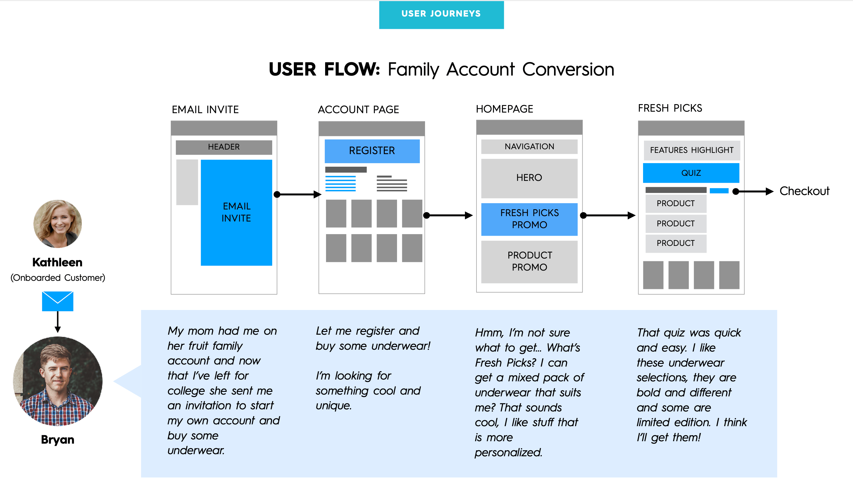 We ideated and sketched out a number of ‘to-be’ user flows we felt would connect with these personas and fulfill their needs. We felt that to connect with younger customers, Fruit would have to embrace more user generated content and be more transparent with their values, sustainable practices and heritage.