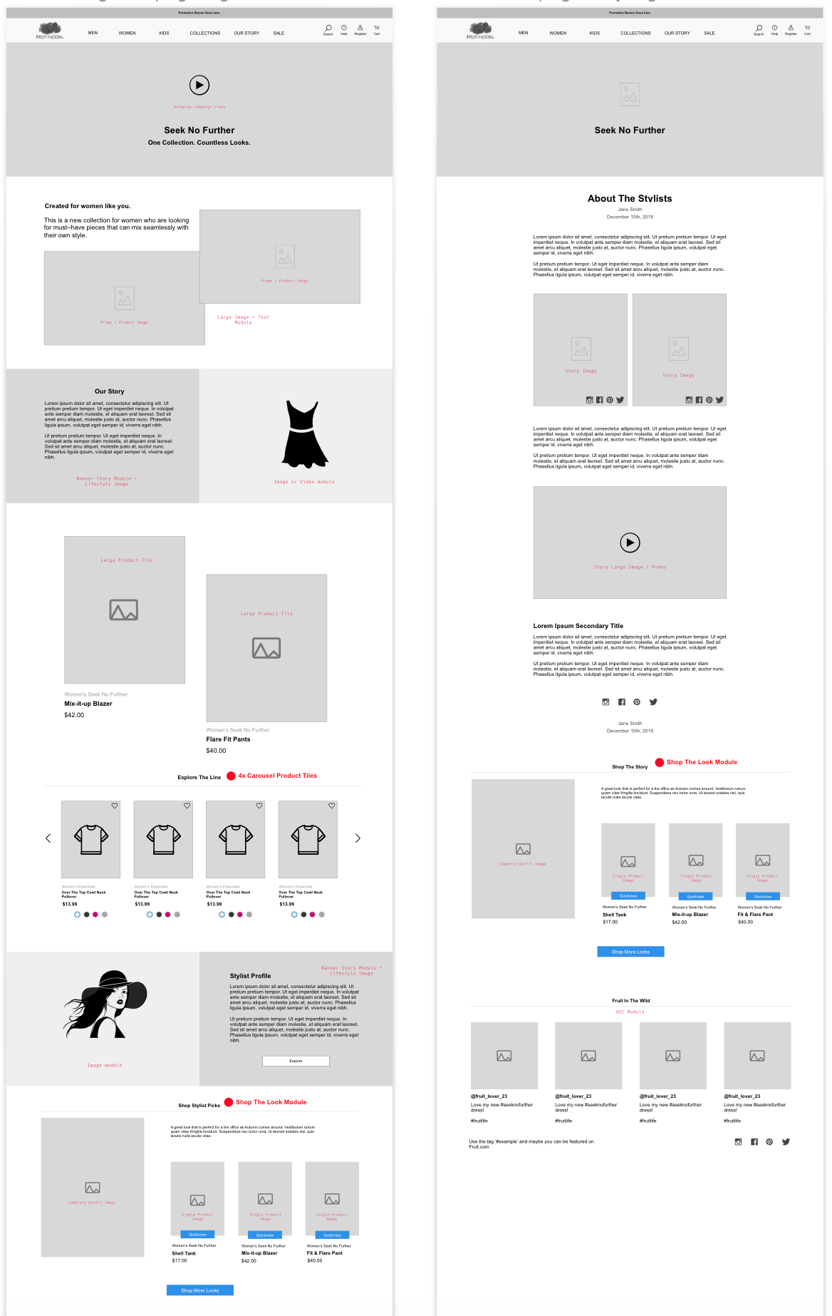 In sprint 3 we focused on category landing pages and marketing pages. These would be essential for releasing new products, showcasing campaigns or telling brands stories. I knew these pages had to be modular and multi purpose so I designed a number of simple multi-purpose modules such as large header videos and image spreads as well as more dynamic modules such as ‘stylist picks’. Fruit could build a marketing page using this toolbox of different modules to suit a variety of needs.