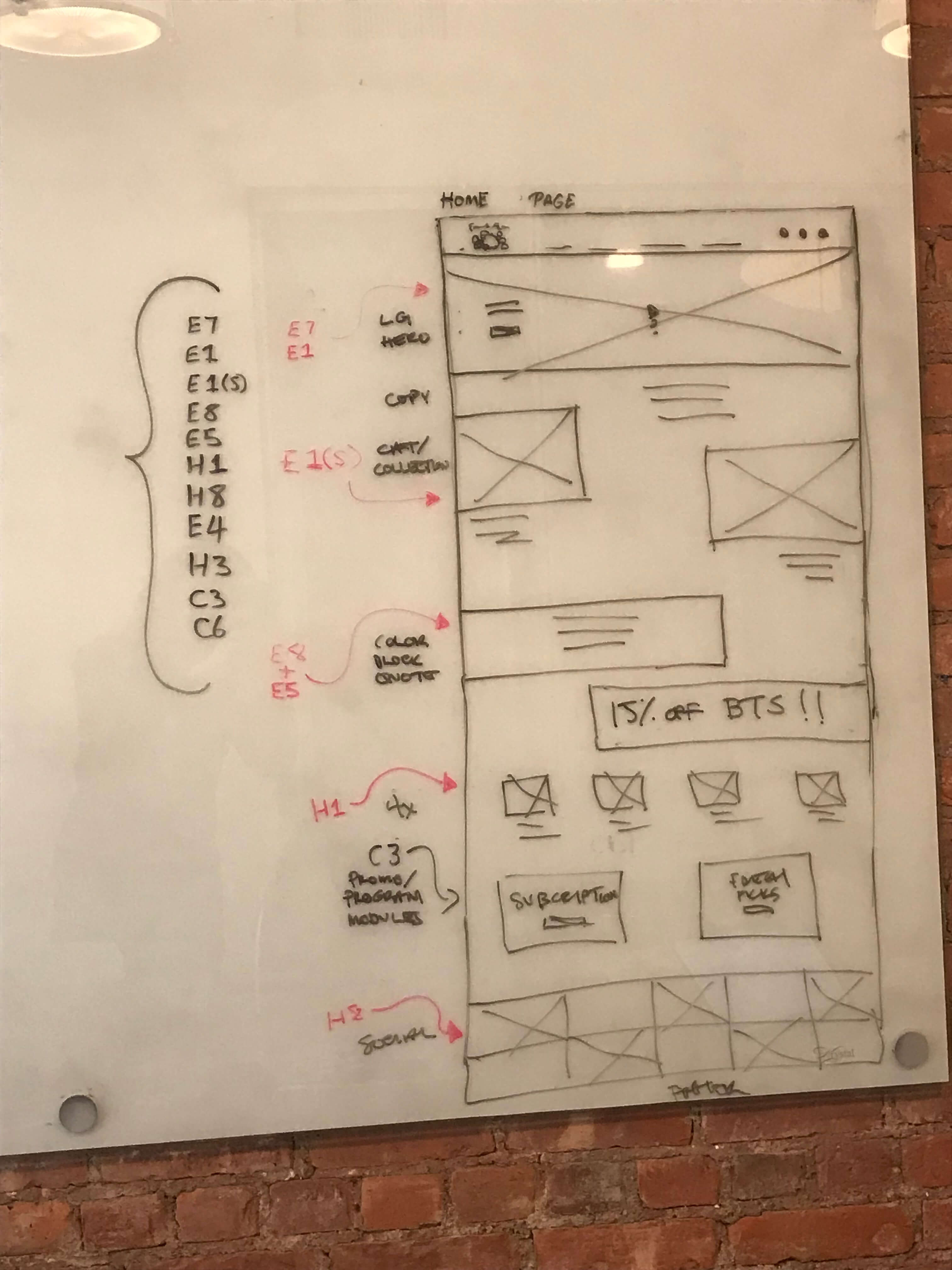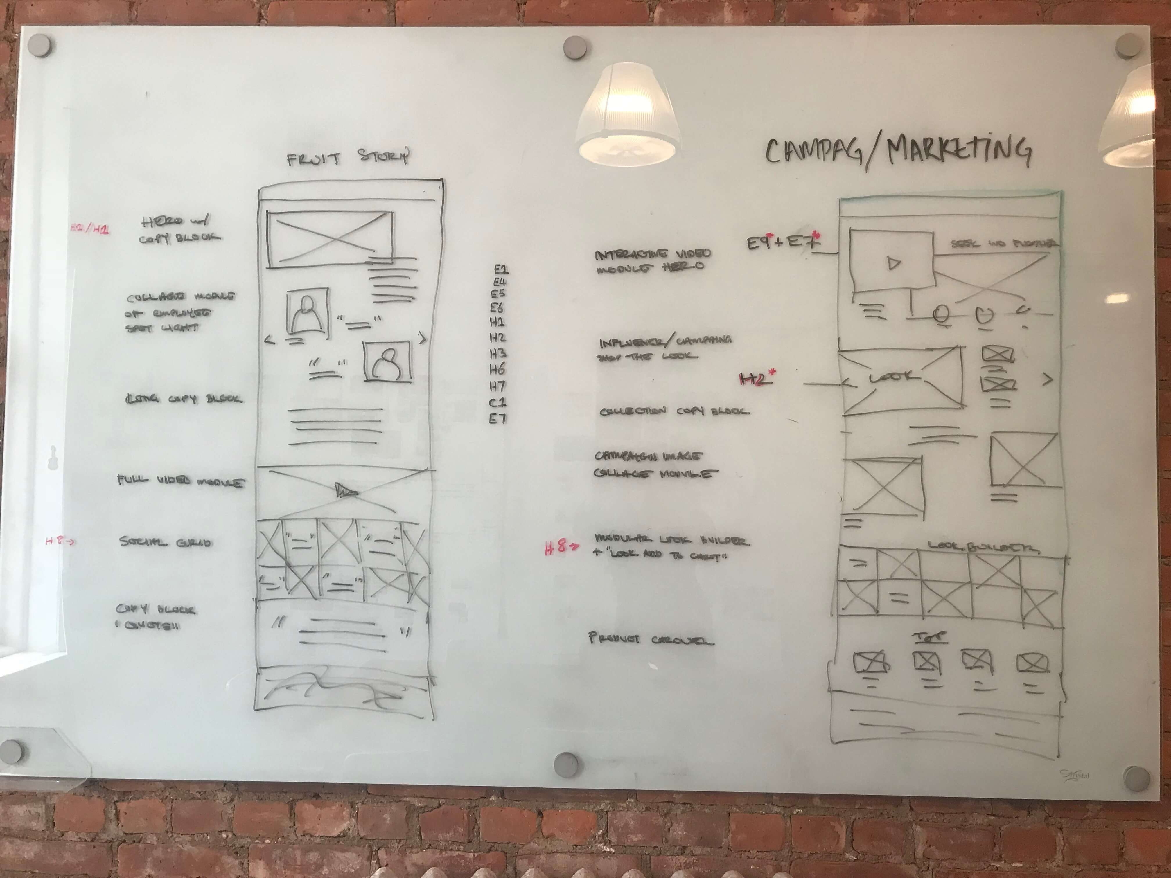 At the beginning of this project, the team flew out too Bowling Green, KT to meet with Fruit’s leadership. We conducted a kickoff and requirements gathering workshop and as the primary UX designer on the project, I hosted a collaborative UX workshop with the Fruit team. In my UX workshop, I white boarded and sketched with the Fruit team to discuss their vision for the site, what kind of functionality they wanted and what kind of modules they believed would be beneficial. In turn, Fruit presented their extremely in-depth customer analytics and customer research they had conducted over the past few years.