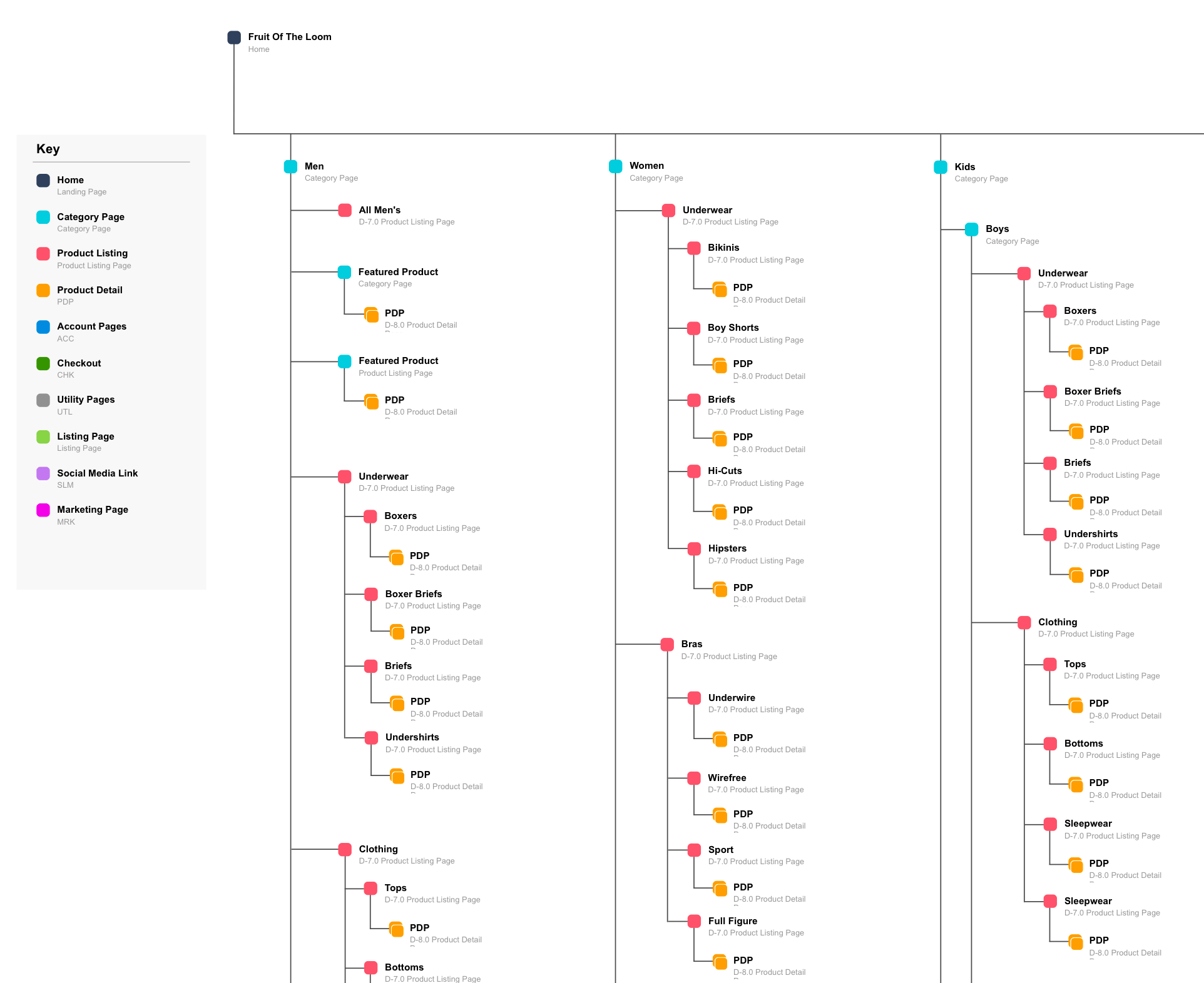 Our first challenge during the sketching phase was to map the existing site taxonomy and refine it. Fruit had a lot of redundant and unfocused categories that we wanted to remove, merge or improve. I went through each category and subcategory and documented each product and created a new category hierarchy. One of our decisions was to merge the ‘Boys’ and ‘Girls’ categories into one category due to the limited number of products in each category.