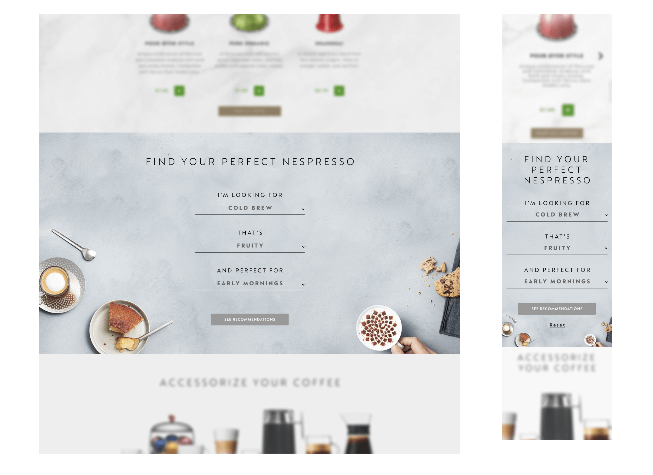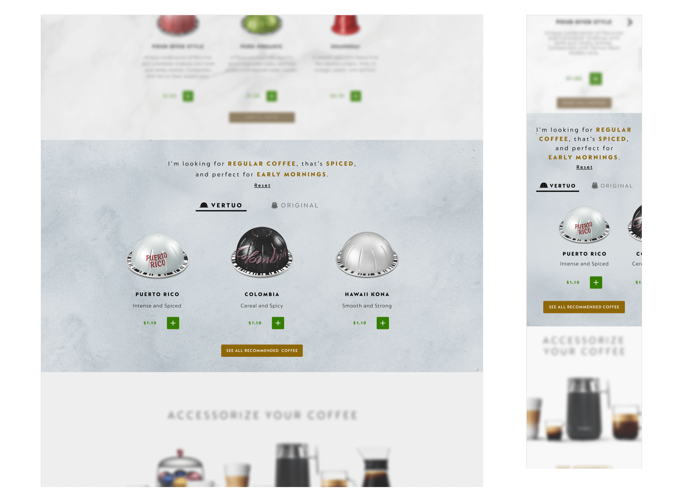 We iterated through a few variations of the wireframes before moving into the final design phase. Our Sr. Visual Designer led the design effort, applying the Nespresso style guide and bringing our new modules to life. I worked closely with our design team to ensure the wireframes transition smoothly into final designs and each module and interaction was displayed as intended.
