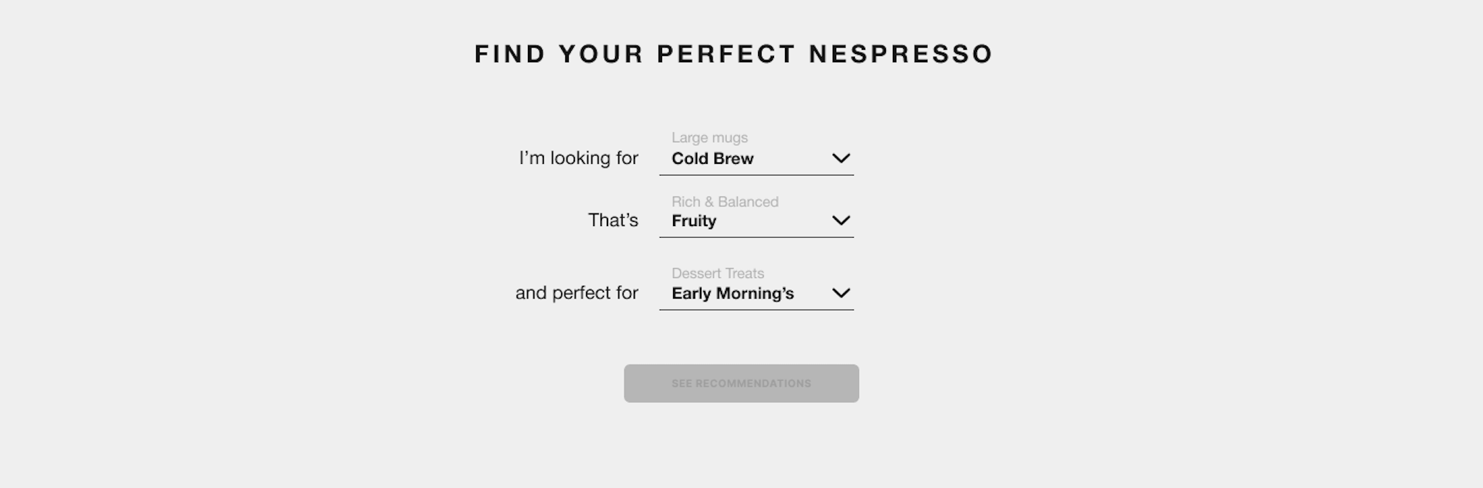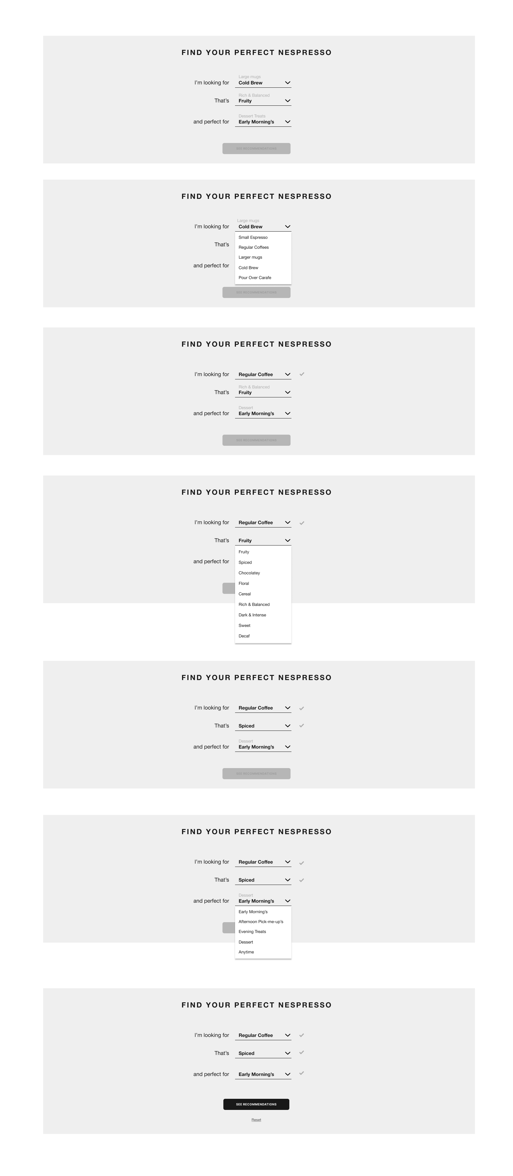 During the wireframing phase we added an interactive guide selling module. We were keen to explore new ways to help new and existing customers to find the types of coffee they were interested in. I based my designs on a previous guide selling module I designed during the WW project that was very successful. The module acted as a product finder using three dropdown menus to allow the user to make selections. Once the user has made their selections, they are shown an array of matching products. This module acted as an alternative, interactive pathway to product.