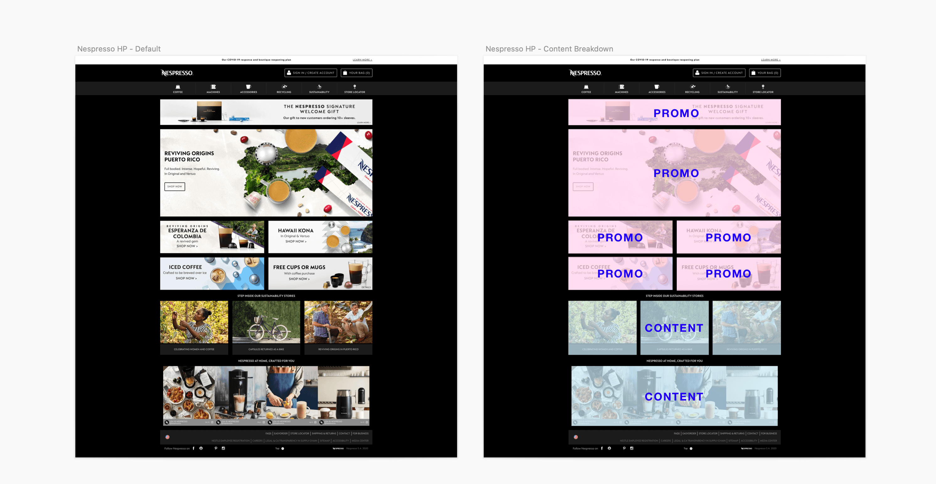 Side-by-side breakdown of content types on the original Nespresso homepage.