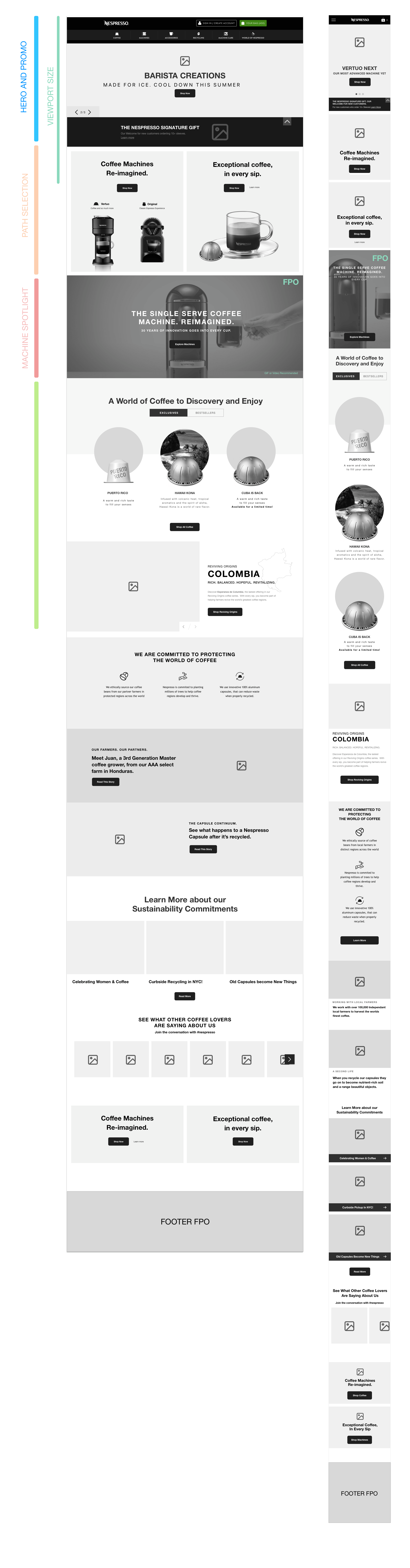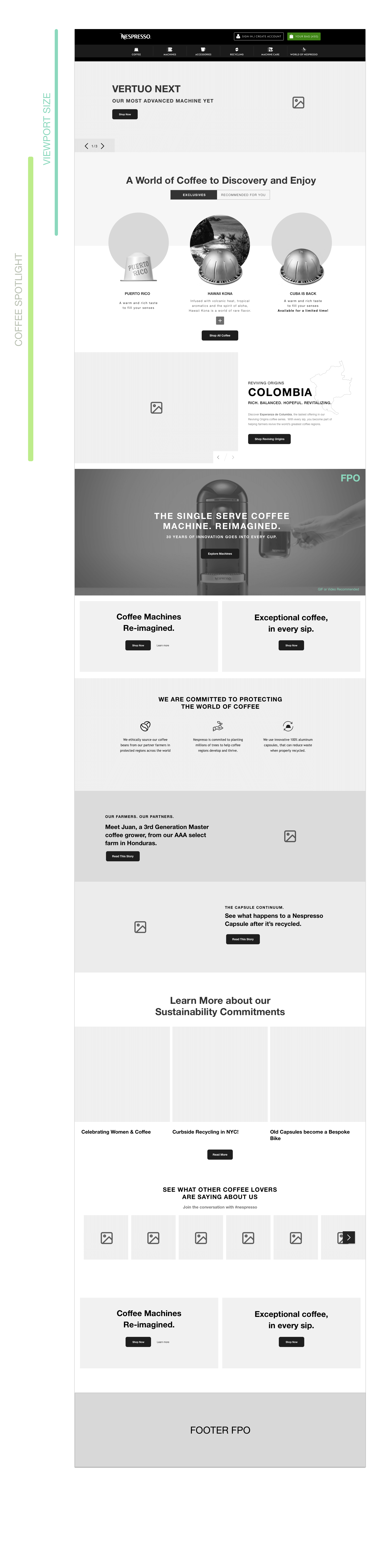 After aligning on the general page and content layout we started to evolve our sketches and zone diagrams into higher fidelity wireframes. We had be mindful to work within the restrictions of the 'page designer' system that Nespresso was using to implement their site. Each module had to be relativly simple in design, utilizing just imagery, text and CTA's.
