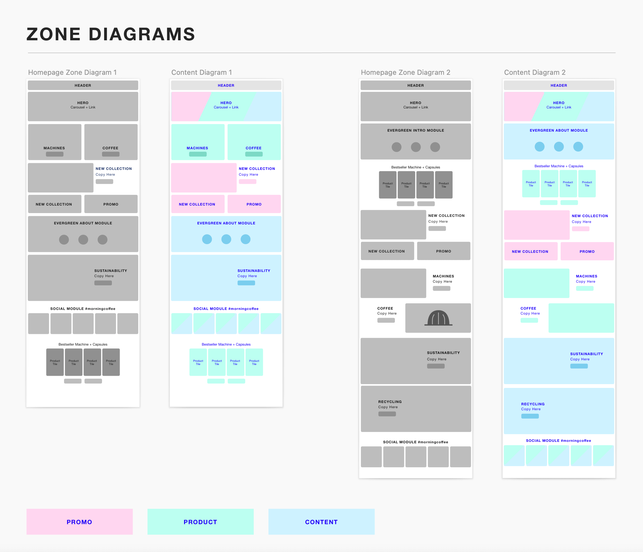 We workshopped the zone diagrams with the Nespresso team to get their perspectives on the content layouts. Our thinking was to display a mix of content types above the fold highlighting promotions, products and brand content. Below that display evergreen product pathways into the two primary product categories. Finally we would display a mix of promotional modules and brand content modules.