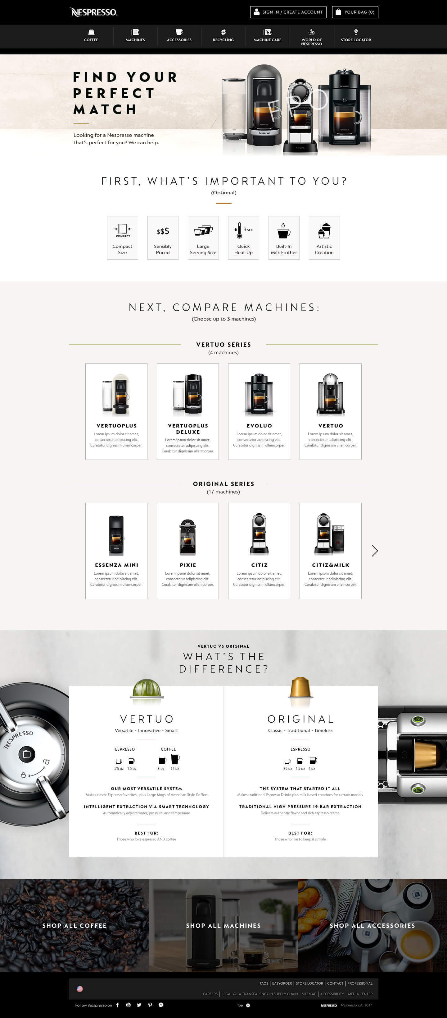 In 2018, I worked with Nespresso on the ‘Machine Assist’ project. The challenge was to create a comparison page for the various Nespresso coffee machines. Nespresso wanted to create a digital space where customers could view and compare all their different machines in one place. At this point Nespresso had dozens of machines with features from ranging from simple coffee making to more complex barista style machines. To make more challenging, Nespresso had released a new type of coffee capsule that only worked in certain machines. It was essential for us to make a simple and easy to use page that would guide users to the machine that best suited their needs and then funneled them to purchase.