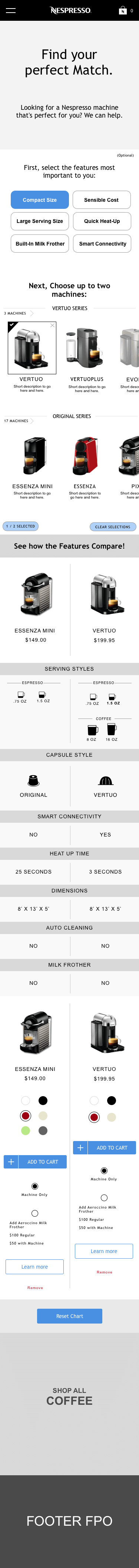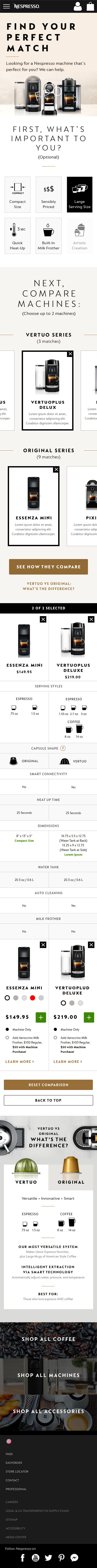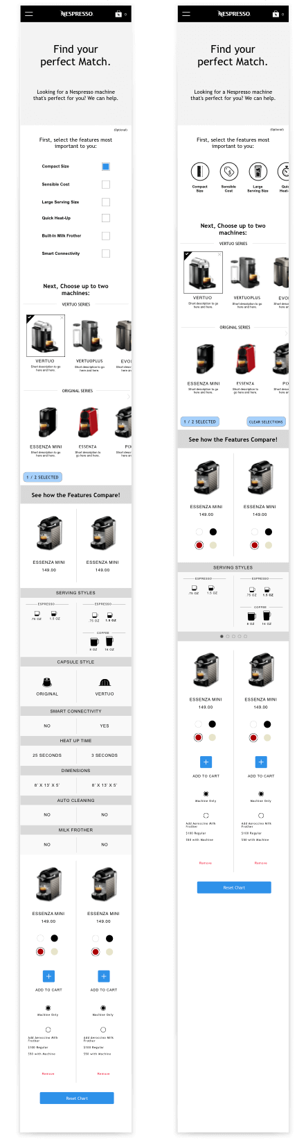 Underneath the ‘needs filter’ I designed a space to hold machines from both capsule lines, ‘Original’ and ‘Vertuo’ and allowed the user to select up to three machines to compare in a dynamic comparison chart. We opted to limit the the comparison chart to three machines as we were conscious of presenting too much data and information in the comparison chart as well as the ability to display the module on mobile. We opted to instead make it incredibly quick to add and remove machines to the chart.