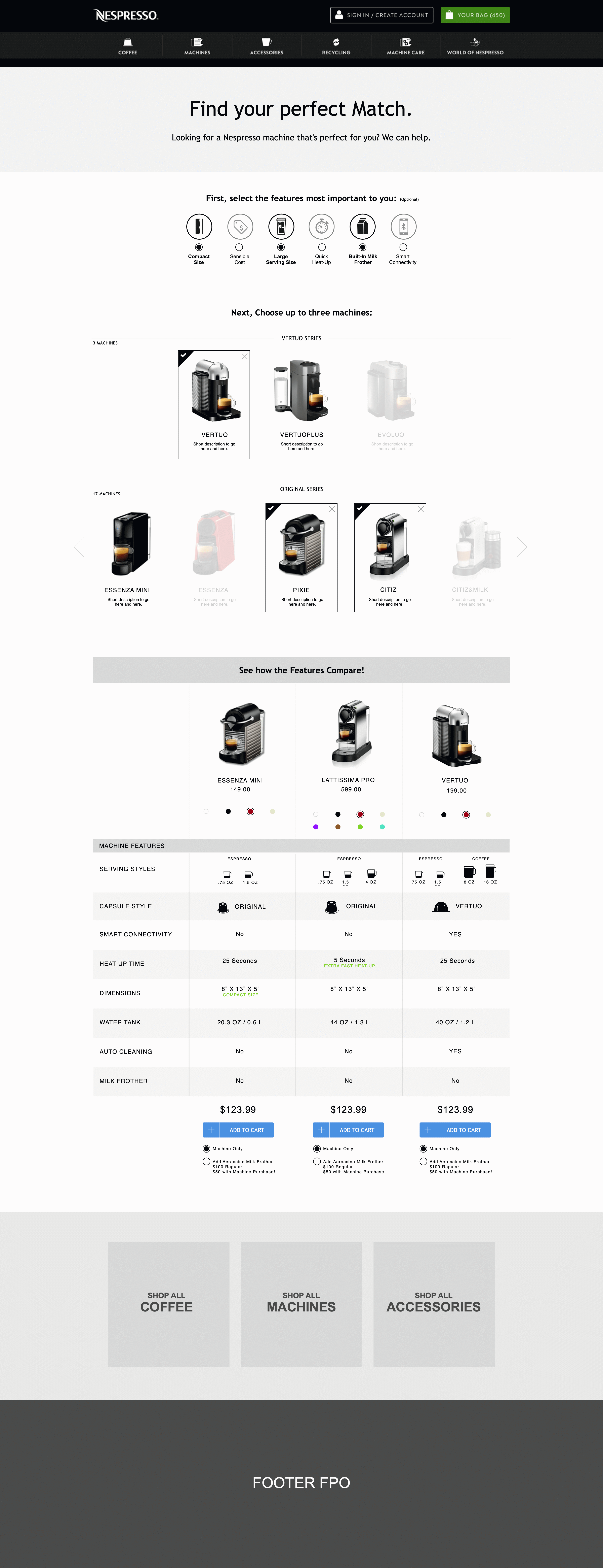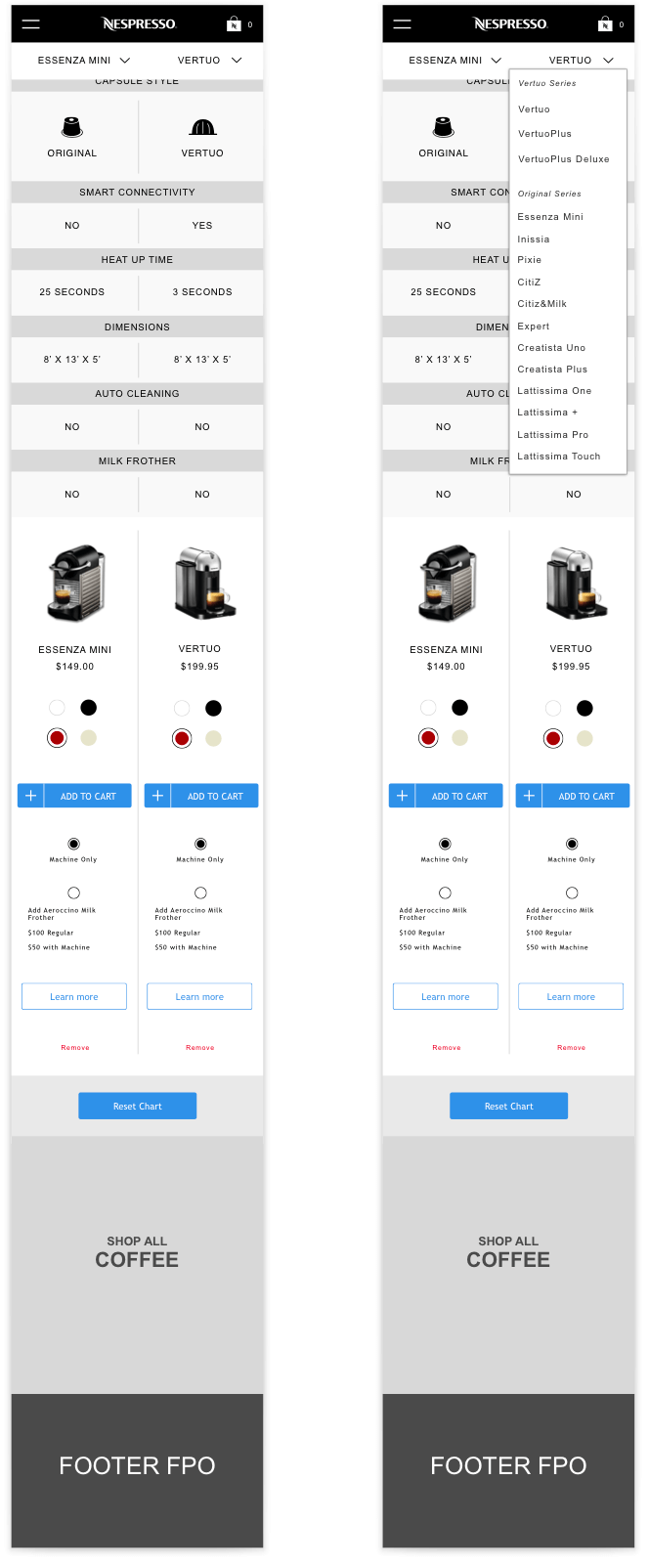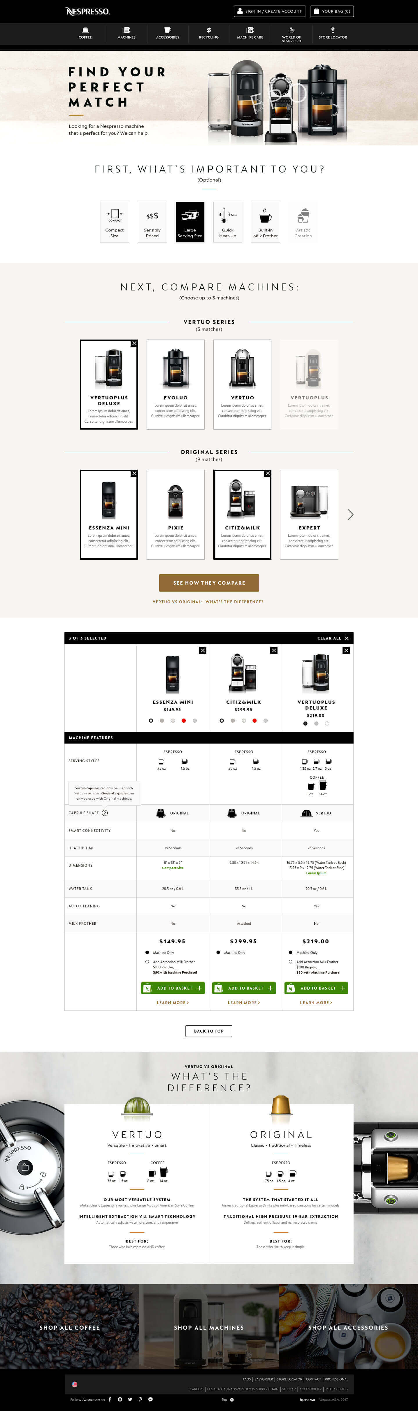 Underneath the ‘needs filter’ I designed a space to hold machines from both capsule lines, ‘Original’ and ‘Vertuo’ and allowed the user to select up to three machines to compare in a dynamic comparison chart. We opted to limit the the comparison chart to three machines as we were conscious of presenting too much data and information in the comparison chart as well as the ability to display the module on mobile. We opted to instead make it incredibly quick to add and remove machines to the chart.