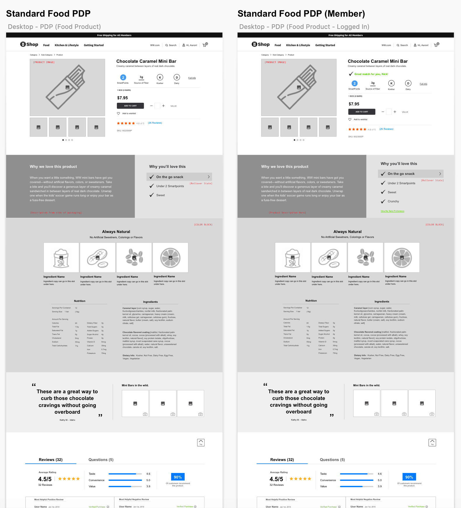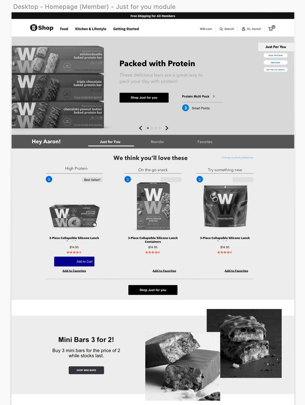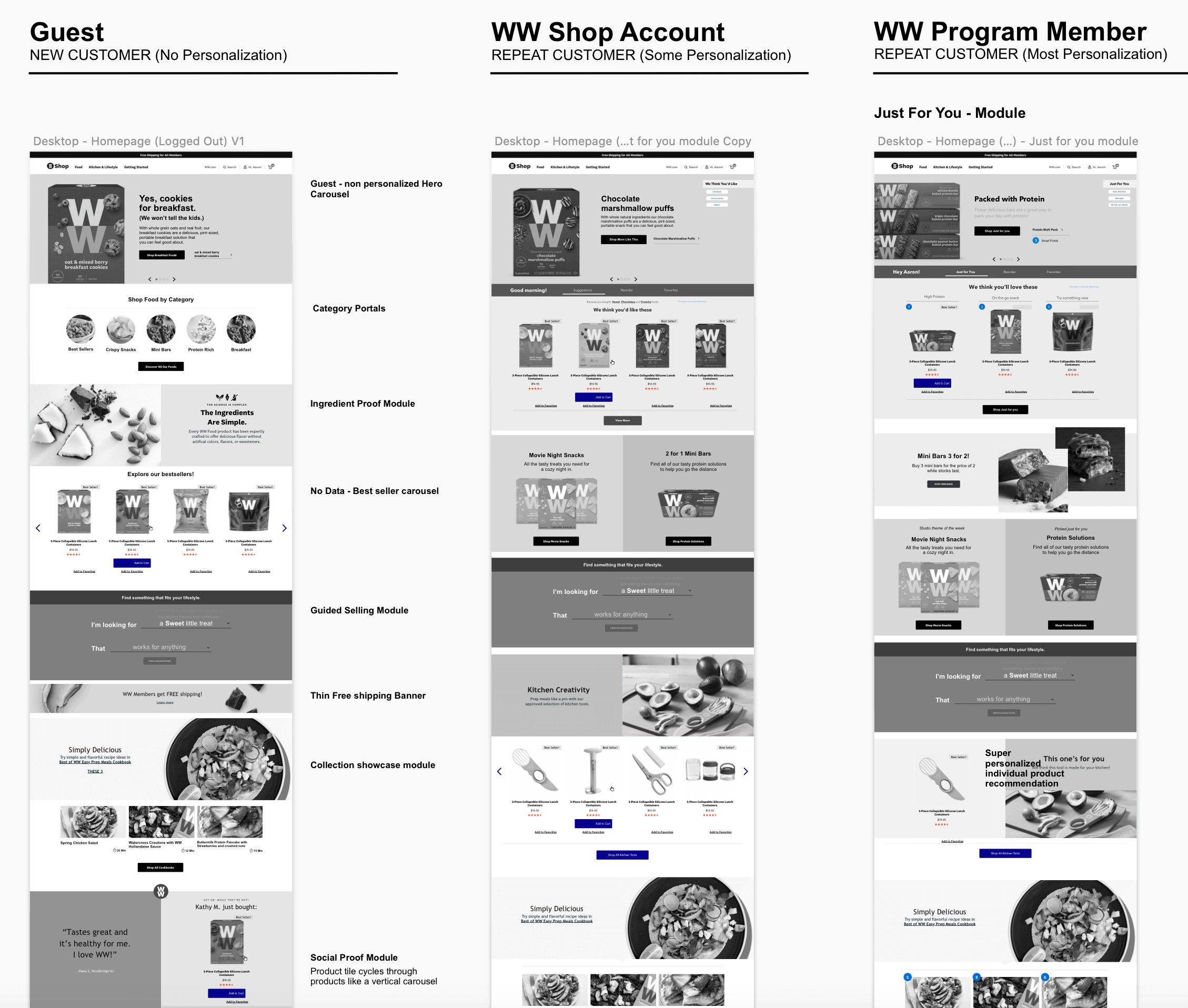 The main challenge for sprint 3 was the homepage. This would be many users’ first impression of the site and it needed to be impactful. I sketched out and wireframed 3 variations of the homepage, one for each user type; guest user, shop account user and WW member. Each variation prioritized different modules. For the member account version we developed a personalized shopping module high up the page called 'Just for you', which allowed returning users to shop favorites effciently. The guest version focused on introducing users’ to the WW program and WW products using promotional modules and the guided selling module.