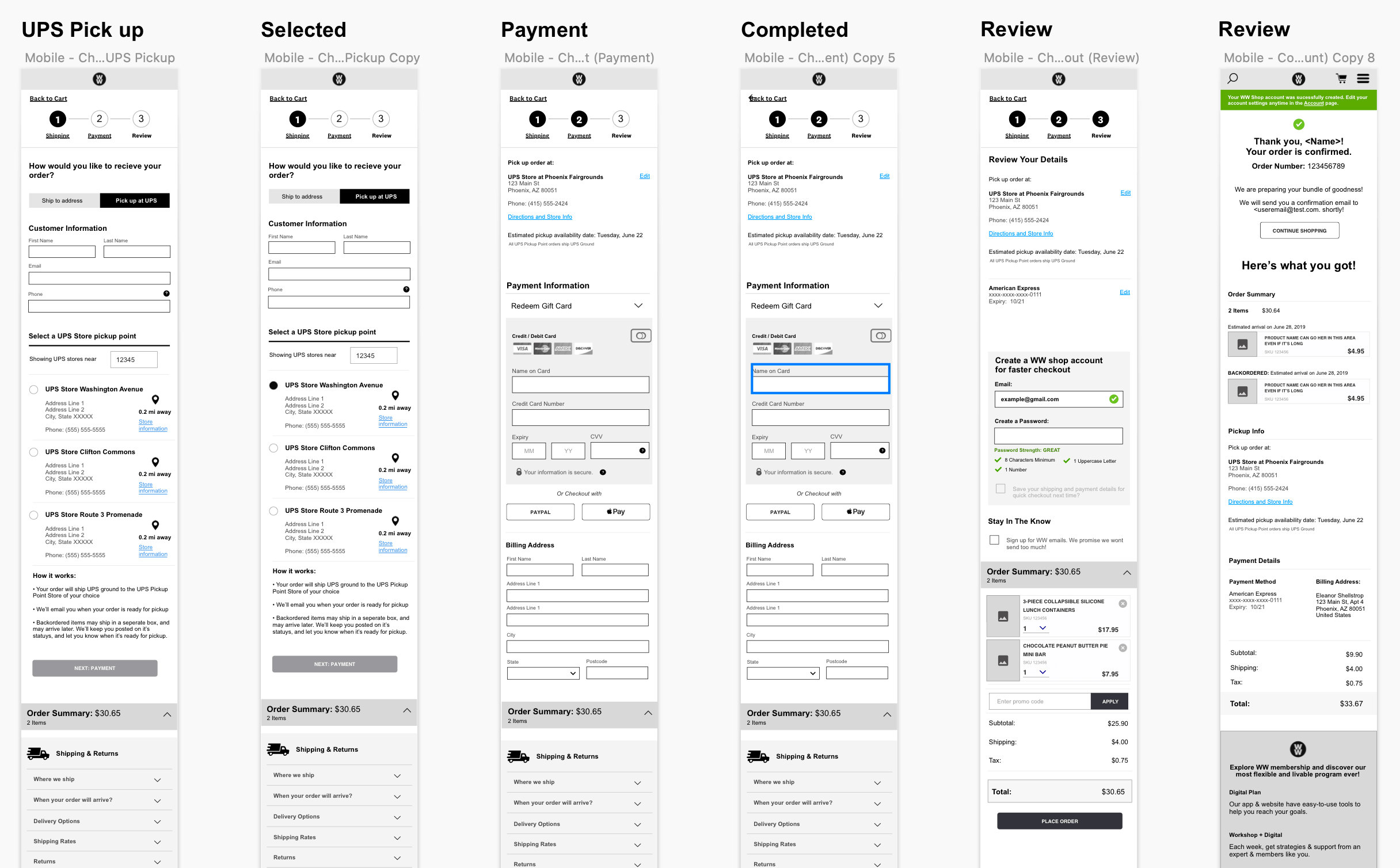 Sprint 2 was challenging as it was a very technical sprint as the cart and checkout experience contained multiple flows, each with many different page states. For example a user can checkout as a guest or a logged in account member and may have a variety of personal information previously saved. I wireframed the entire cart and checkout flow for each user type for both mobile and desktop.