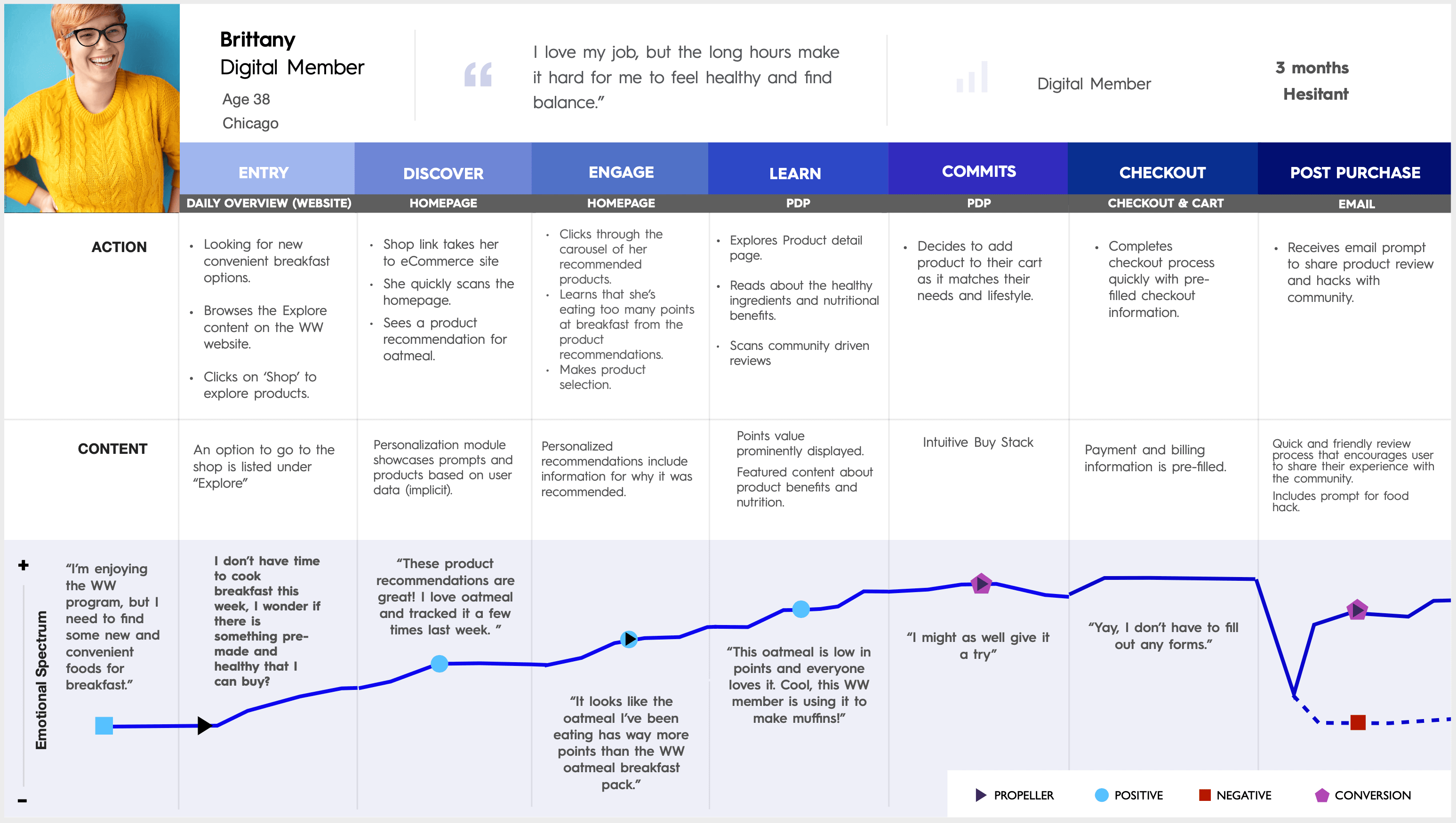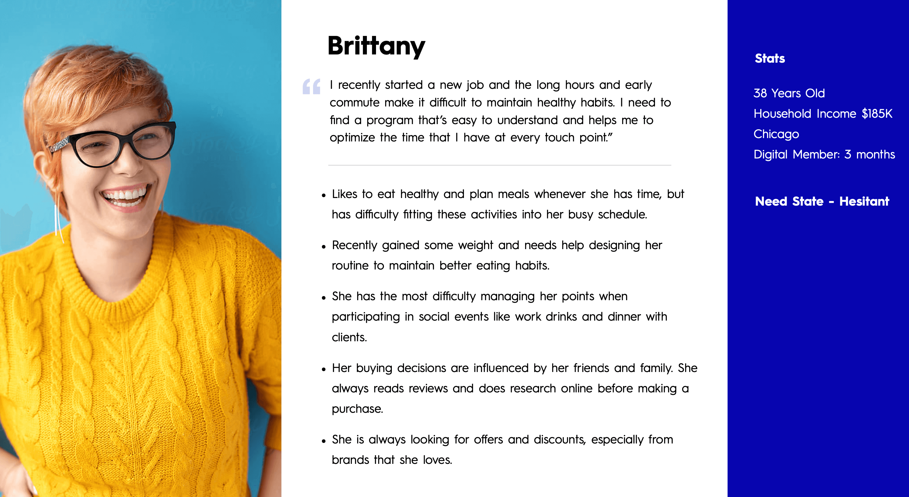 We also conducted additional research using web analytics and WW’s own user research documents. Altogether, we gained a strong insight into WW’s customer’s needs and this allowed us to create three user personas and four user need states.