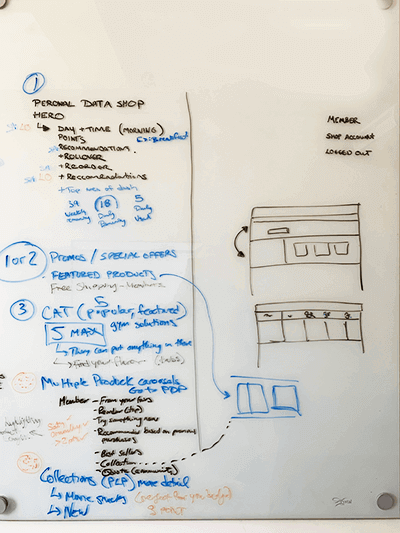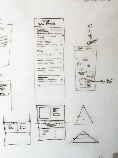 As we conducted research and created the personas, the team started to ideate and conceptualize different modules. Some of these included a type of guided selling module that could help users discover products that suit their personal needs, an ingredient module to transparently explain product ingredients and a customer dashboard that would help regular customers reorder favorites and find similar products.