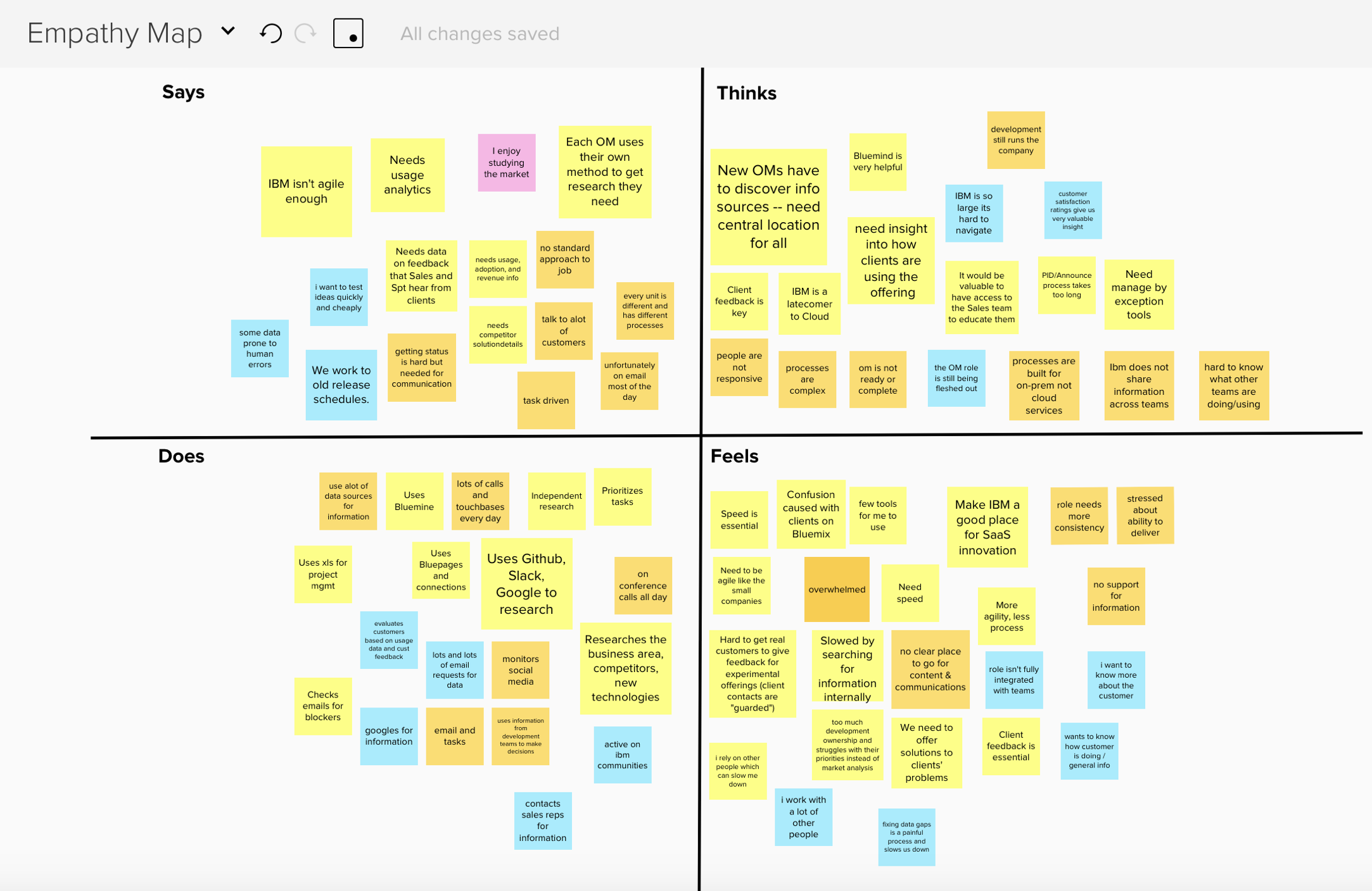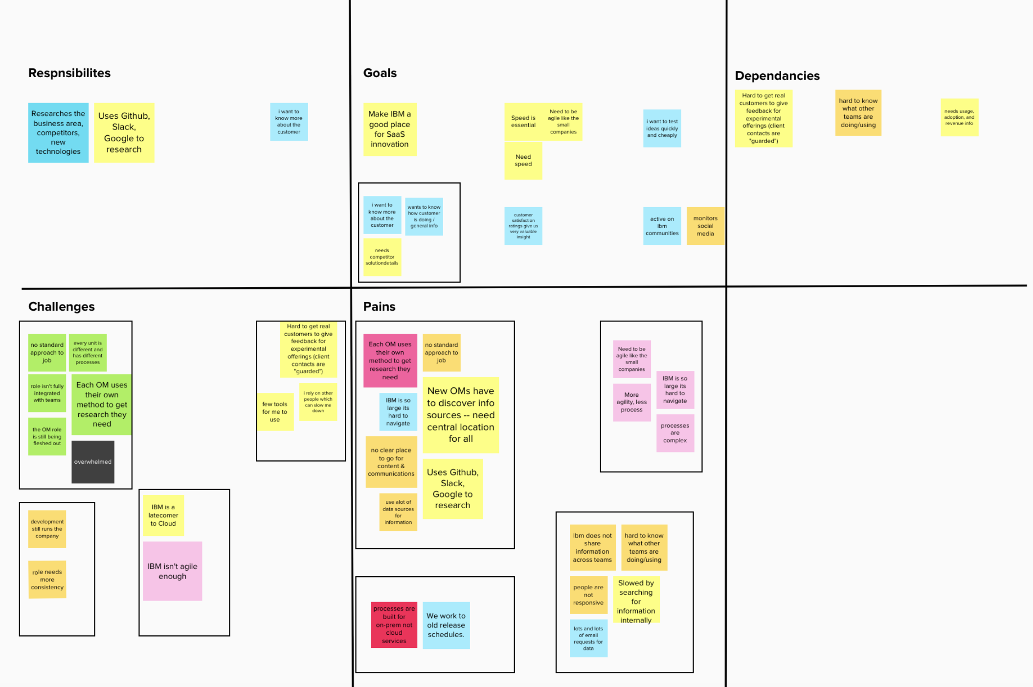I worked as part of an internal development team as the sole UX designer under the guidance of a project manager. At the beginning of the project I conducted user research by setting up interviews with 11 different offering managers across 4 IBM business units. I prepared an interview script and talked with them about the problems and issues they faced on a daily basis.