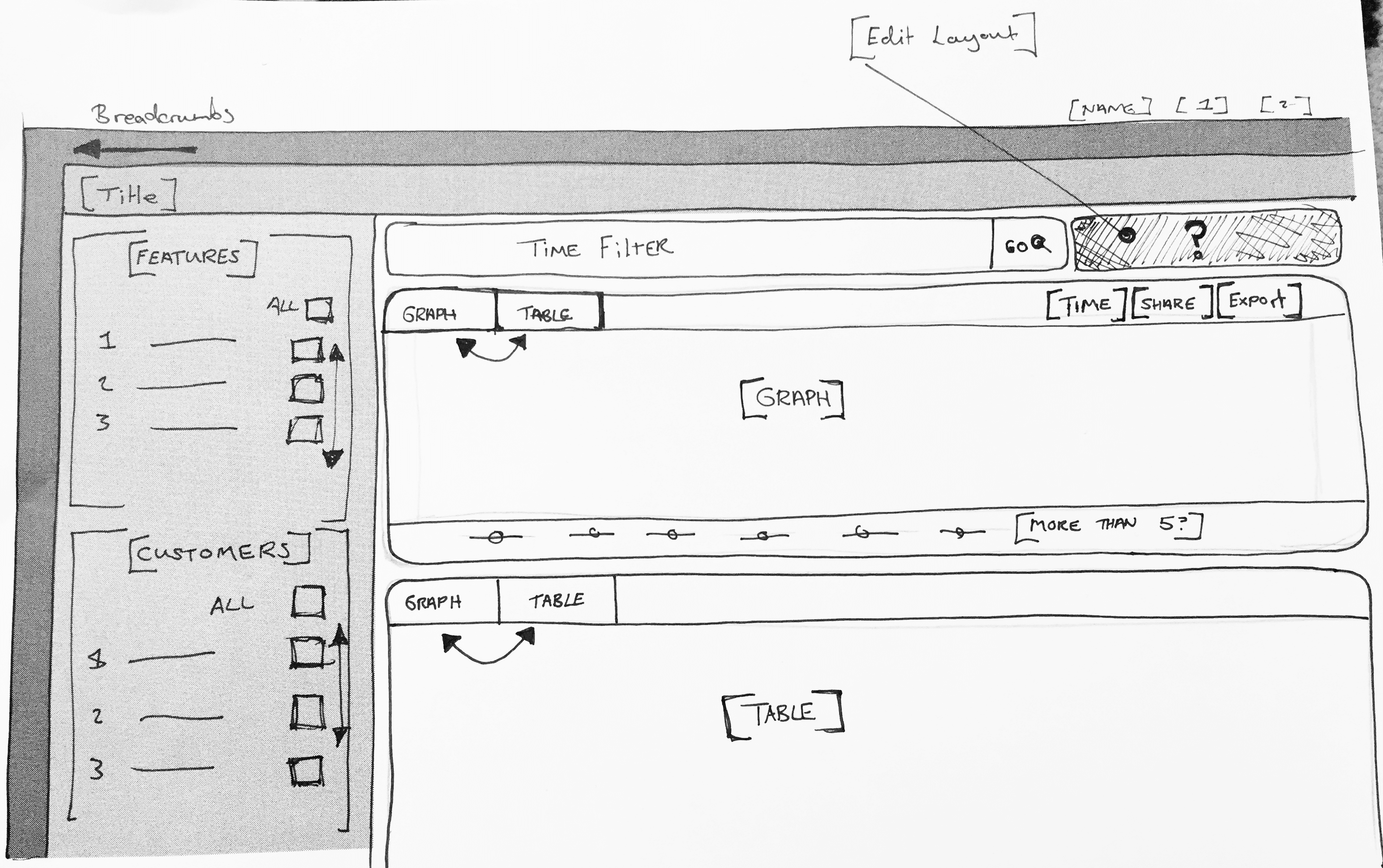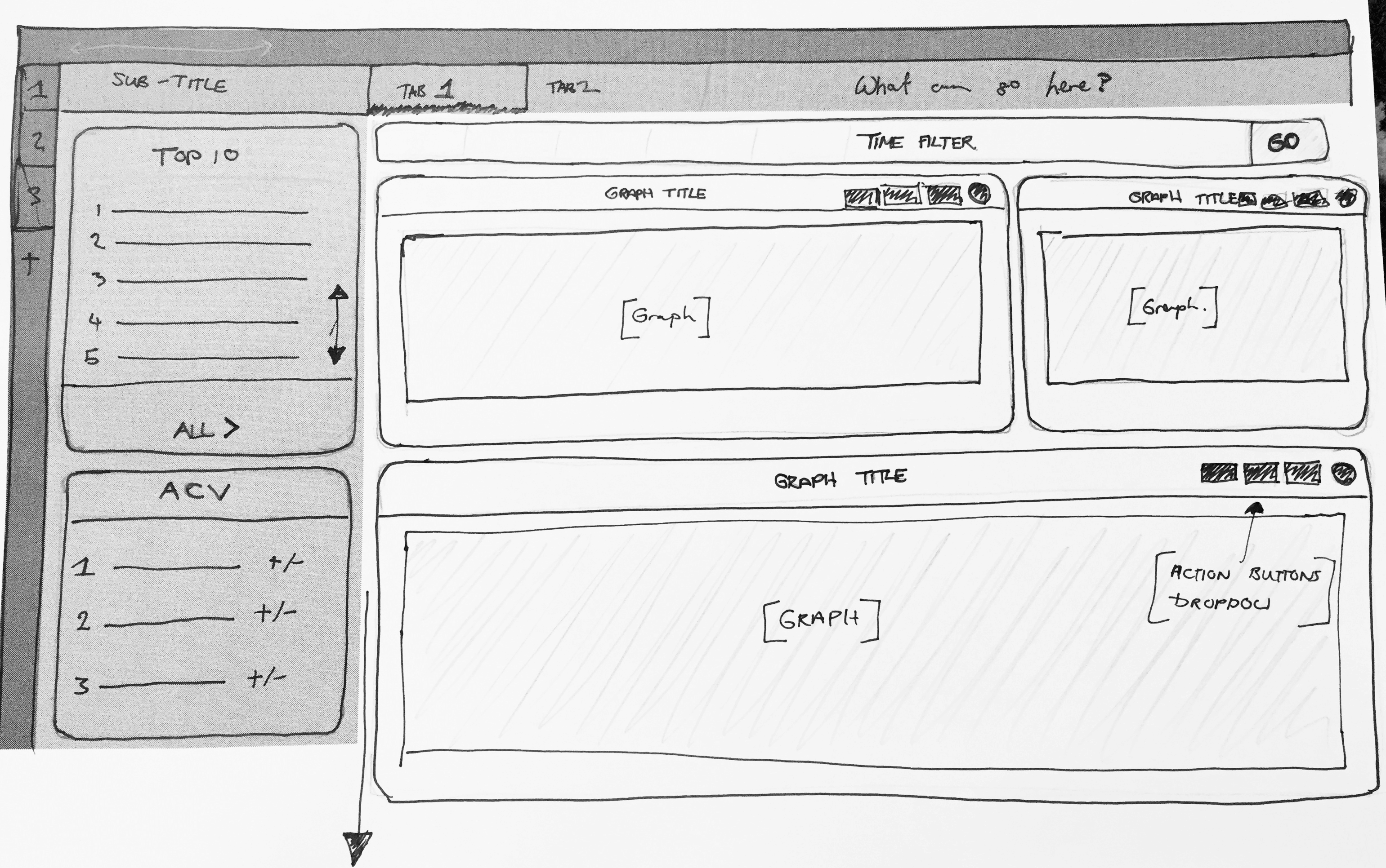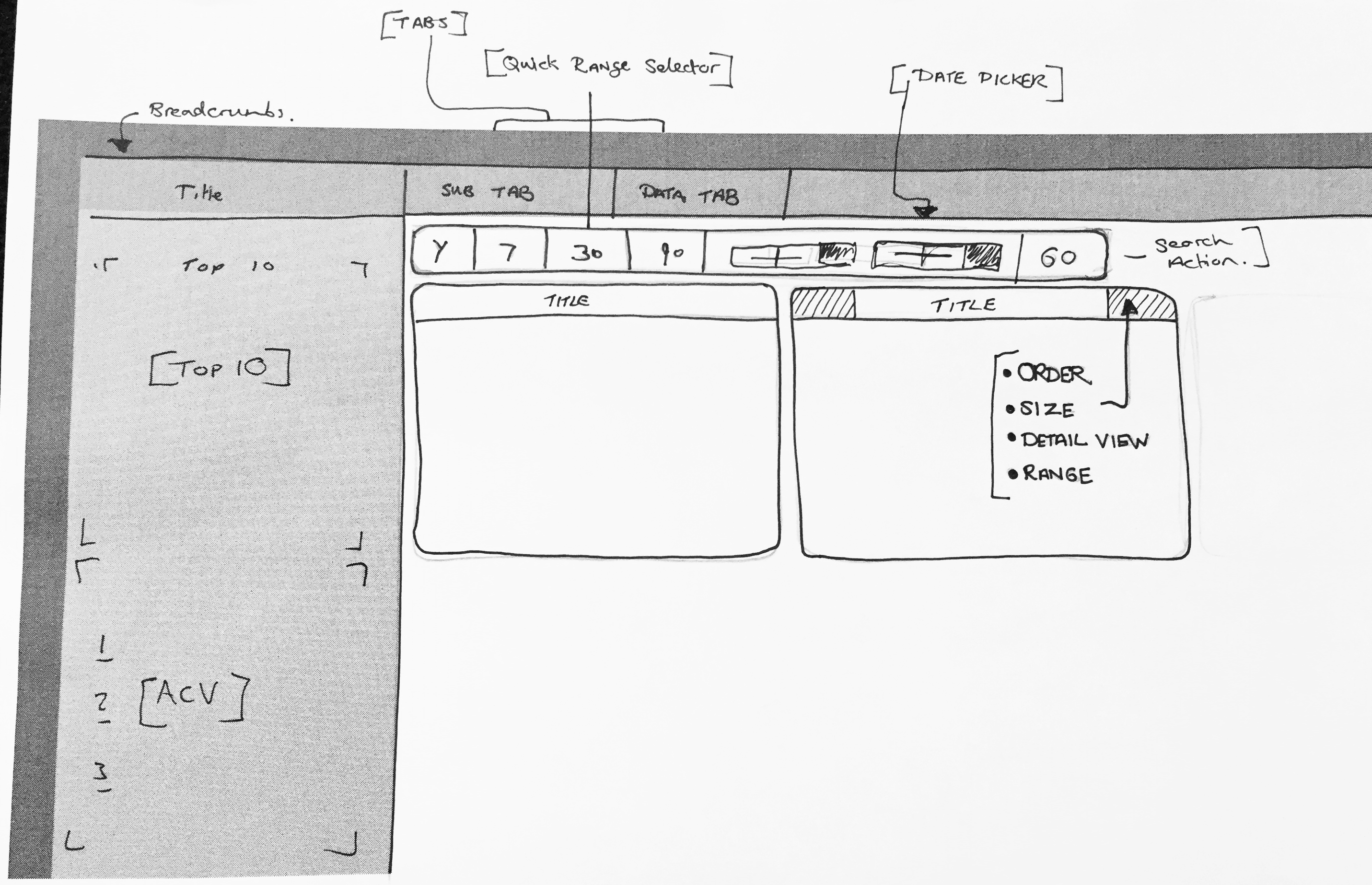 The other main challenge I encountered was designing the main dashboard. There was a database of complex offering information and analytics available to display but it needed a home within the new tool. I sketched out some concepts and settled on a card style layout, where an overview of each data point could be displayed neatly, side-by-side. One of the main reasons I went forward with the card layout was so the user could personalize their dashboard and customize it for their needs. User could then select a card to view in-depth information about that data point.